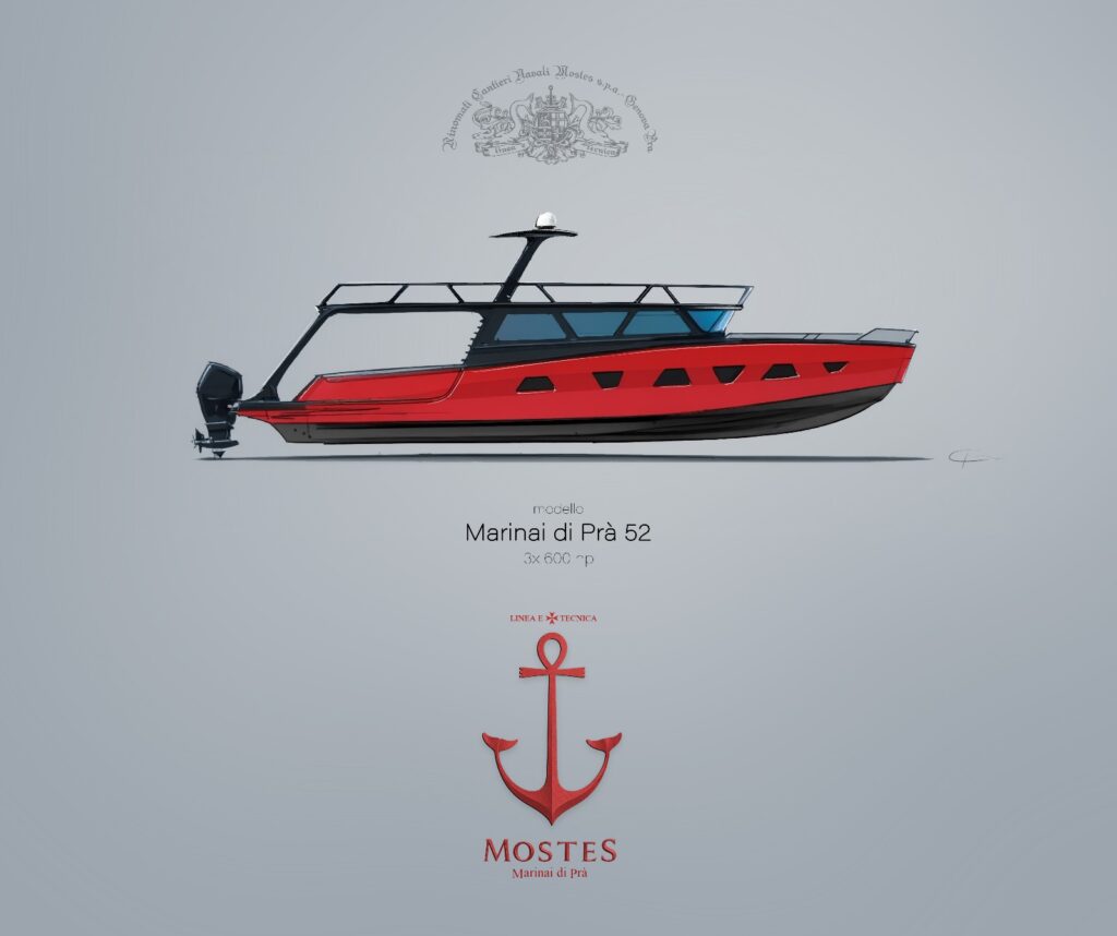 • MOSTES “MARINAI di PRA’ 52” – imbarcazione d’altura dalle linee tese e slanciate, con motorizzazione fuoribordo e dimensioni di 15,90 x 4,70 metri, pensata per affrontare lunghe tratte ad alta velocità con comfort e stabilità anche in condizioni di mare mosso